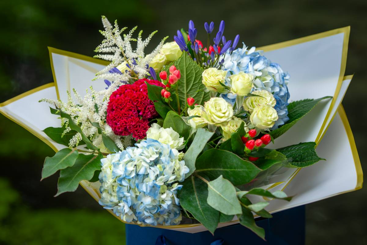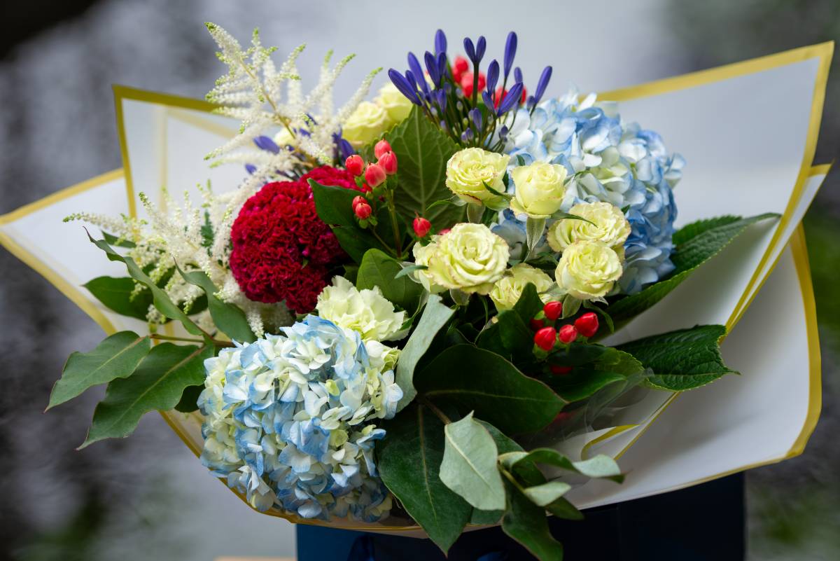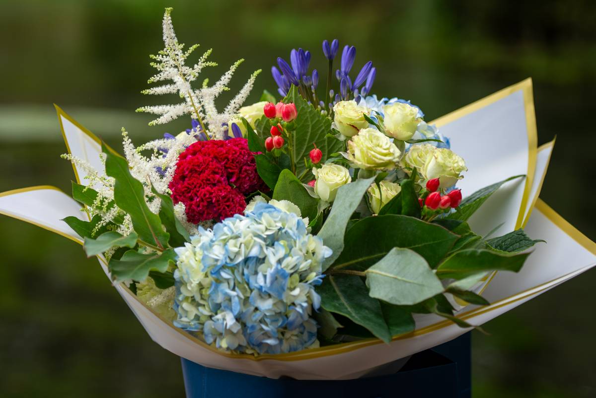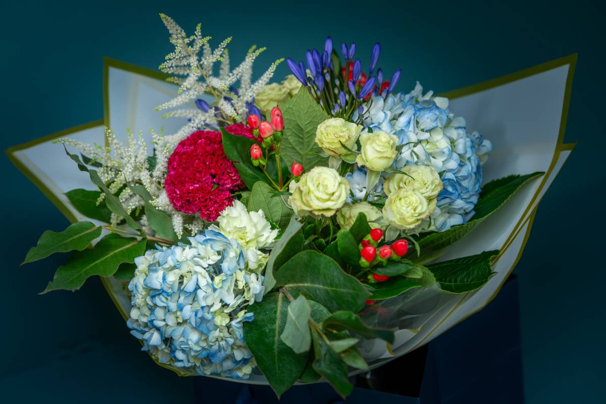 Regal, radiant and full of meaning. Inspired by its name, meaning “queenly,” this bouquet is a bold yet elegant statement. Blue hydrangeas symbolise gratitude, while delicate spray roses bring a soft, romantic touch. Celosia, with its rich texture, represents strength, and Agapanthus Uri - meaning “flower of love” - adds a striking contrast. Hypericum berries symbolise protection and energy, while wispy Astilbe and fresh Eucalyptus Robusta bring movement and depth.