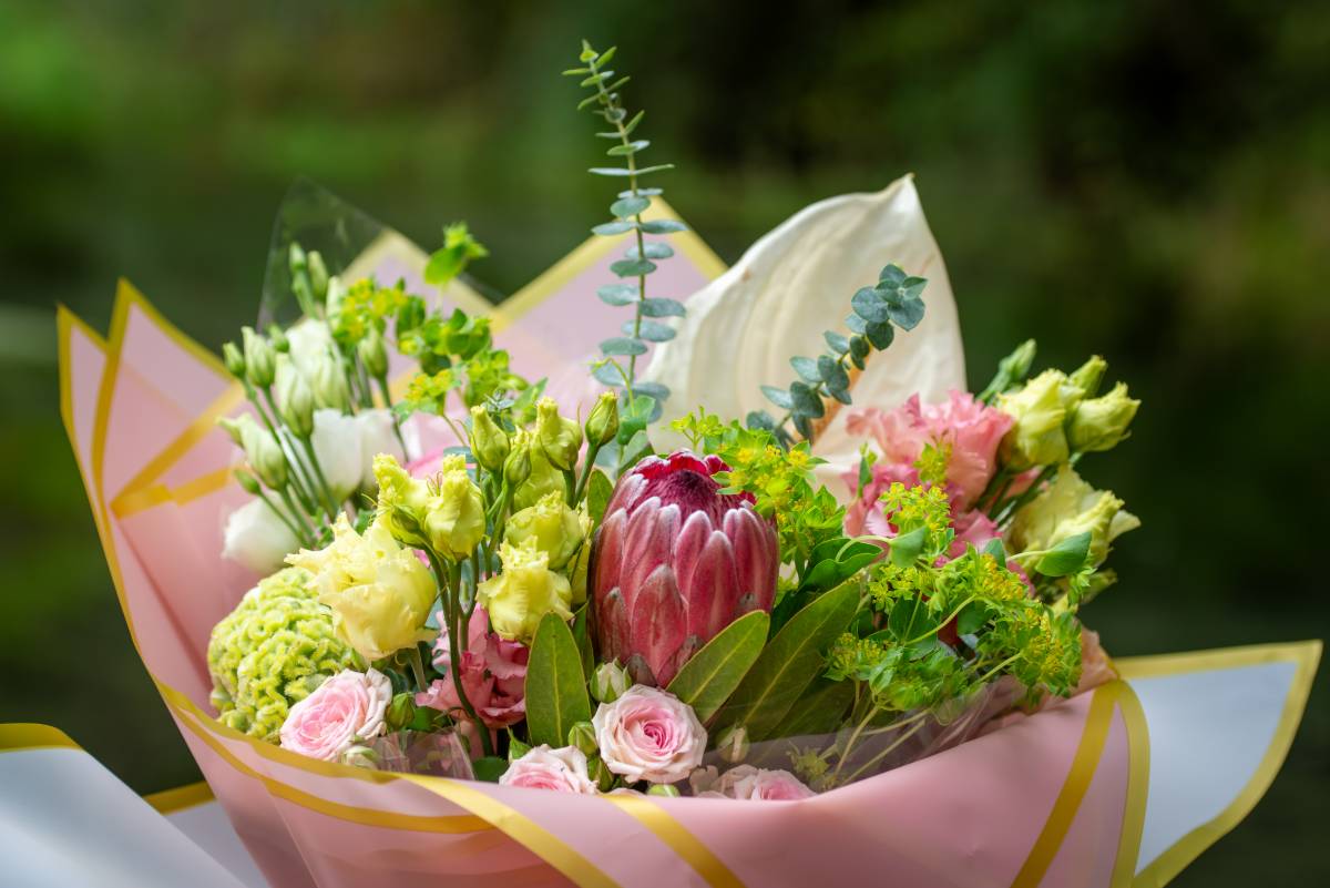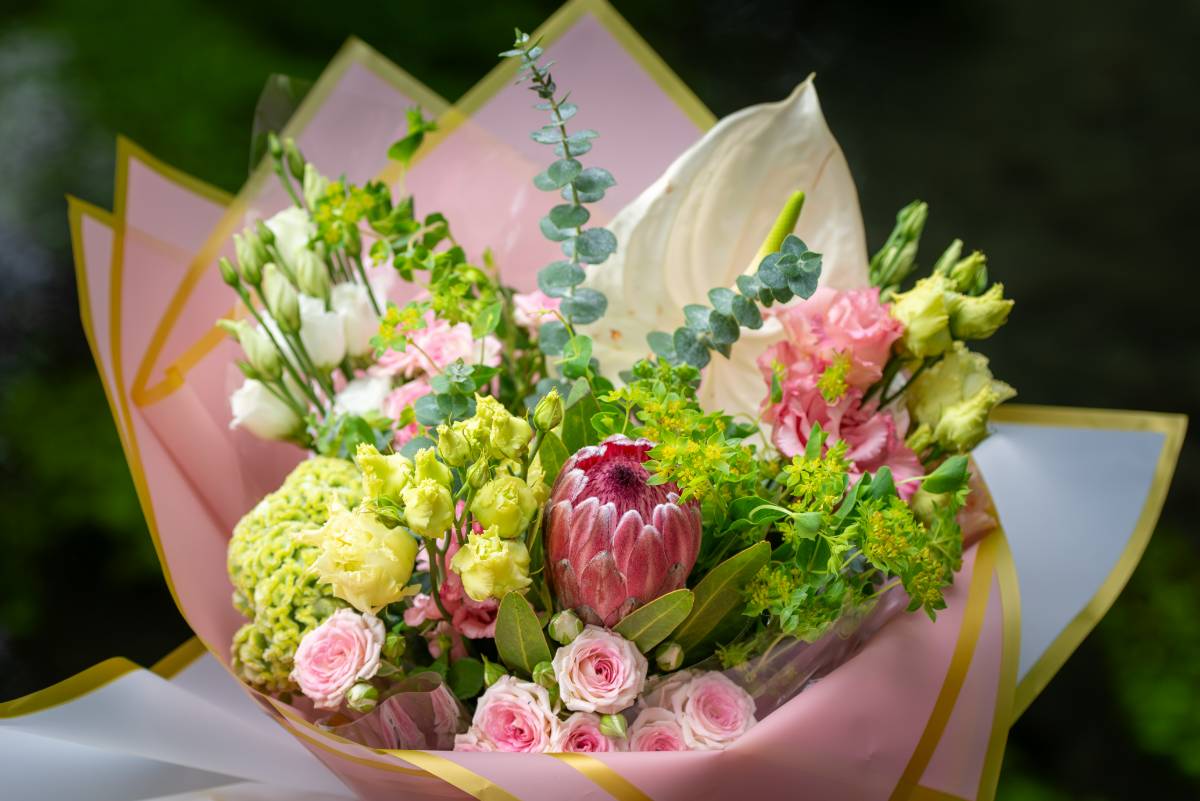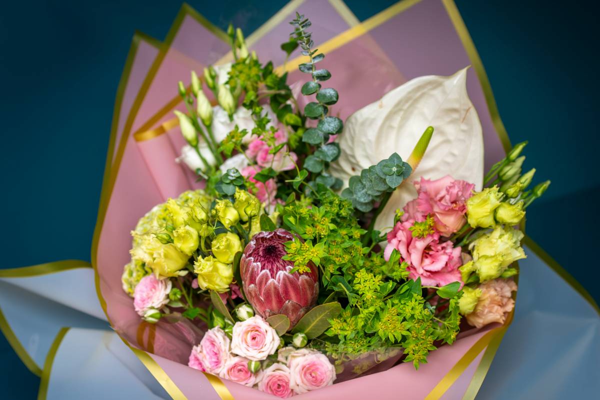 Soft, wild, and effortlessly romantic. Meaning “little rose”, this bouquet is a delicate yet striking mix of textures and colours. Blush and green spray roses symbolise gratitude and admiration, while Lisianthus adds an airy, graceful touch. Celosia’s velvety curves represent boldness and strength, balanced by the exotic elegance of Protea. Anthurium, with its sculptural beauty, brings a modern twist, while Eucalyptus and Alchemilla Mollis add freshness and charm.